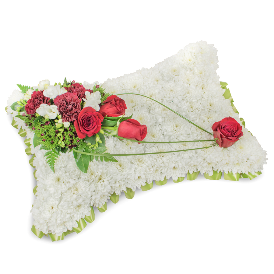 Convey your deepest sympathy with our elegant white and red sympathy bouquet. This beautiful arrangement features pristine white chrysanthemums, vibrant red roses, fragrant white freesias, rich dark red carnations, complemented by delicate dianthus and soft bear grass.